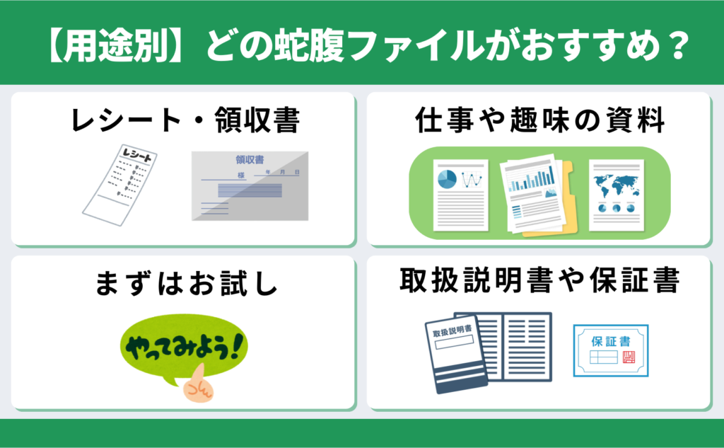 | 蛇腹ファイル | 複数ポケットでカテゴリ別に分類できる | 複数ジャンルの書類をまとめて一元管理 |