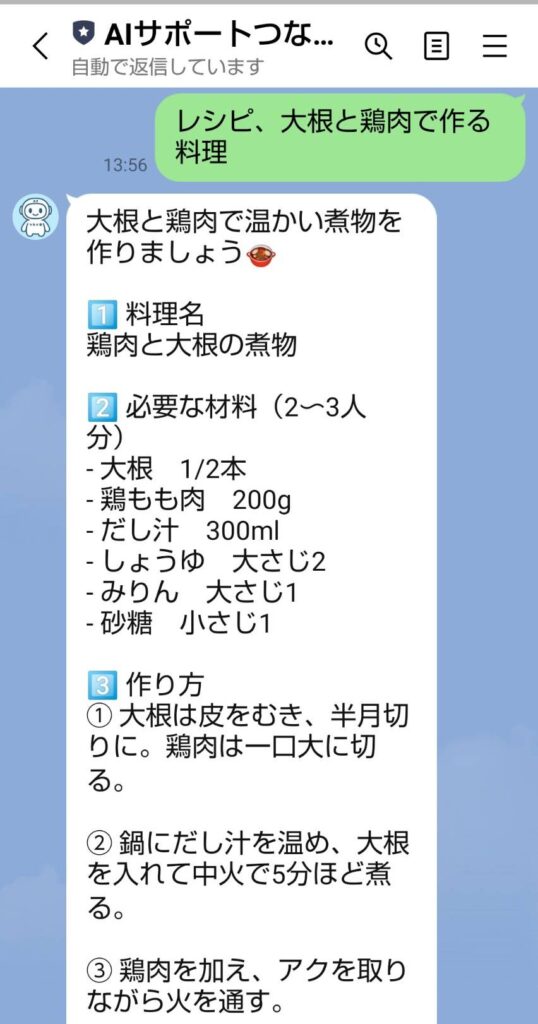 AIサポートつなぐ君は単なる安否確認サービスではありません。AI機能が搭載されていて、LINEのテキストメッセージでさまざまなやり取りができます。