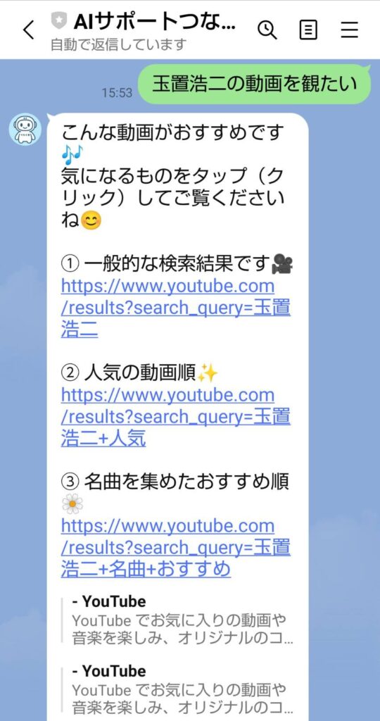 母が「玉置浩二の動画を観たい」と送ると、AIサポートつなぐ君がYouTubeの検索リンクを3パターン(一般的な検索結果・人気の動画順・名曲を集めたおすすめ順)で提案してくれたんです。