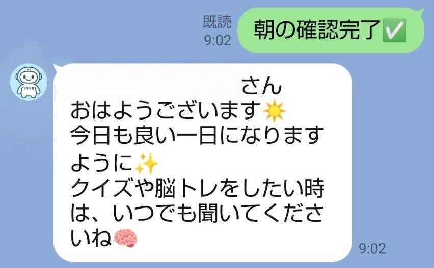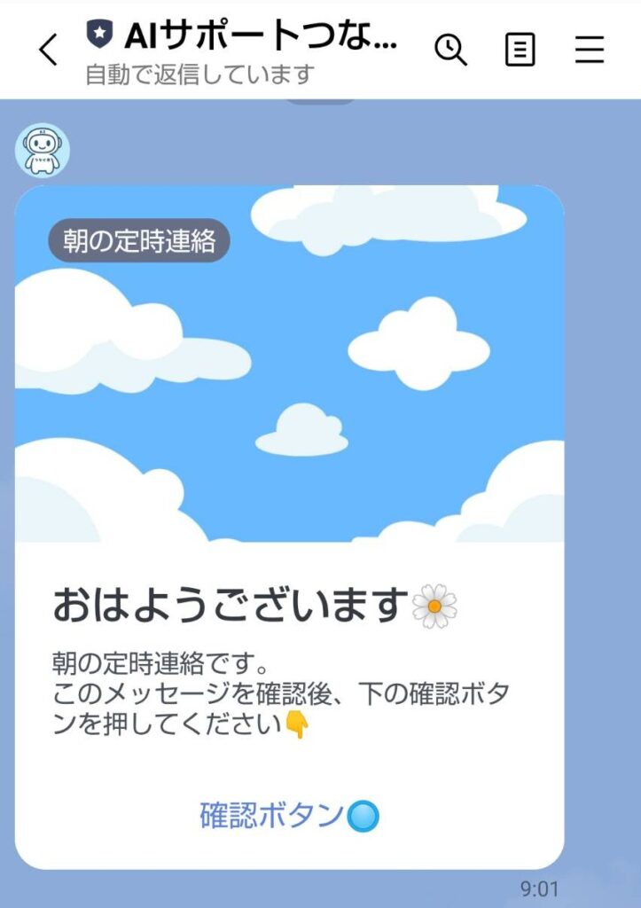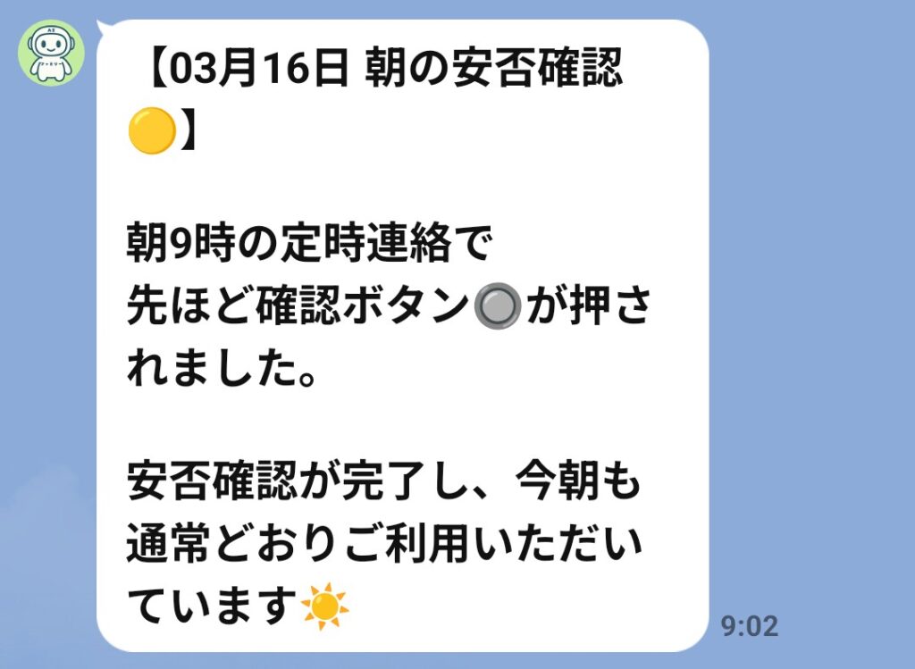 | 定時連絡 | 毎日決まった時間にメッセージが届き、確認ボタンを押すだけ |