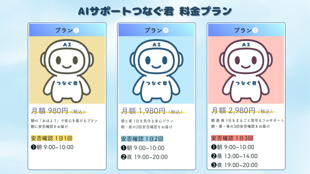 AIサポートつなぐ君の料金体系はとてもシンプルで、安否確認の回数によって3つのプランに分かれています。