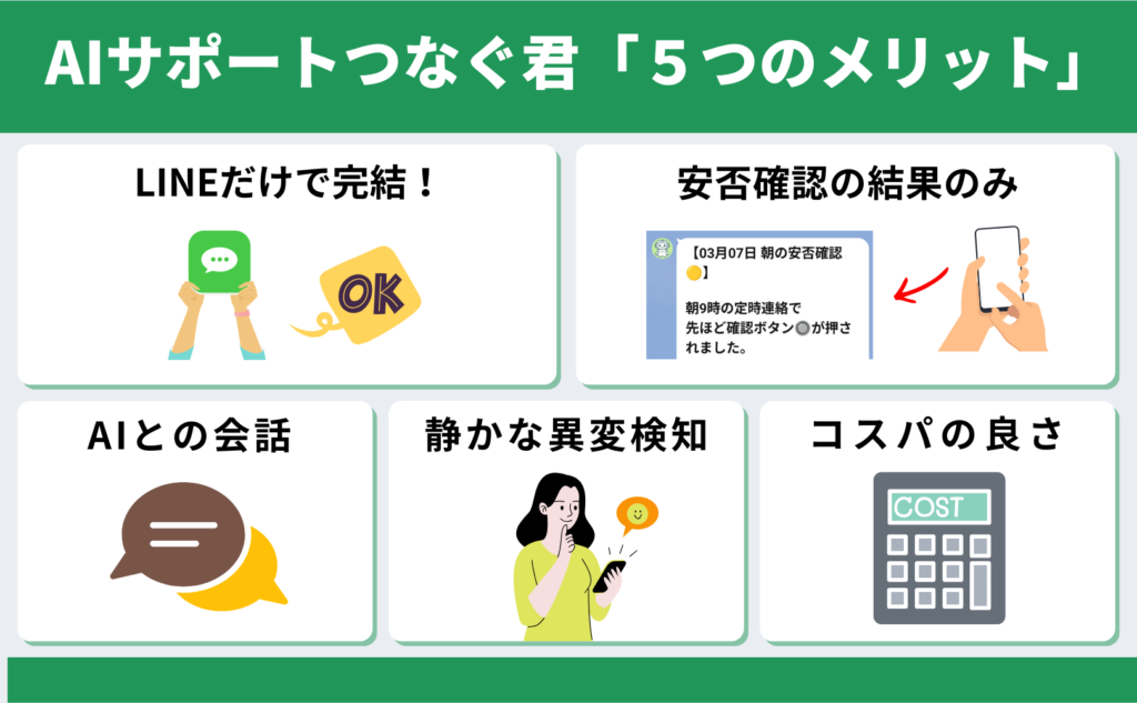 ひと言でまとめると、AIサポートつなぐ君は、LINEだけで完結するAI見守りサービスです。