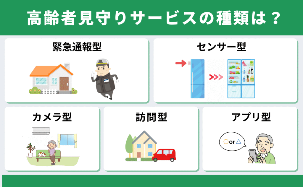 見守りサービスには、高齢者駆けつけサービスがついた緊急通報型、さりげなく見守るセンサー型、映像を通してしっかり見守るカメラ型など、さまざまなタイプがあります。