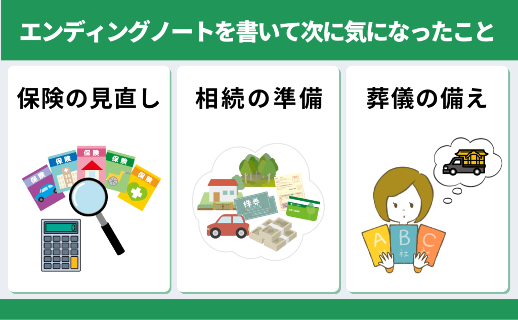 実は、終活の第一歩としてエンディングノートを書き始めた方の多くが、保険や相続、葬儀についても少しずつ備えを進めています