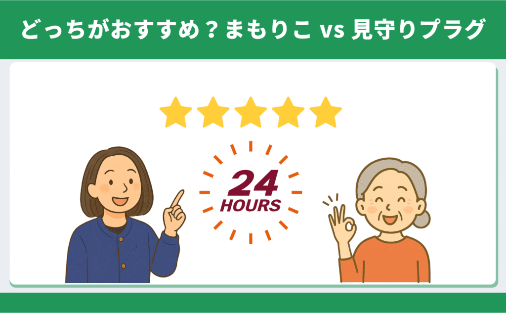 シンプルな見守りをしたい人はまもりこ、生活の変化を細かく知りたい人は見守りプラグが向いています。