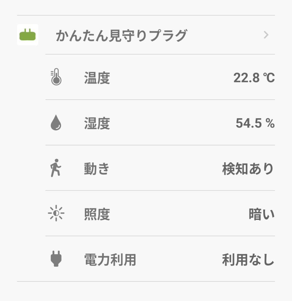 動き・温度・湿度・照度・電力利用、と幅広い情報が分かるため、生活リズムの変化に気づきやすいです。