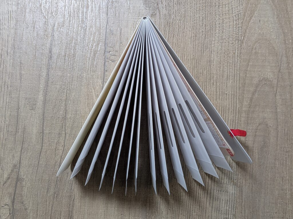 huchoは、12枚の封筒がノートのように綴じられた「封筒貯金」専用アイテム。